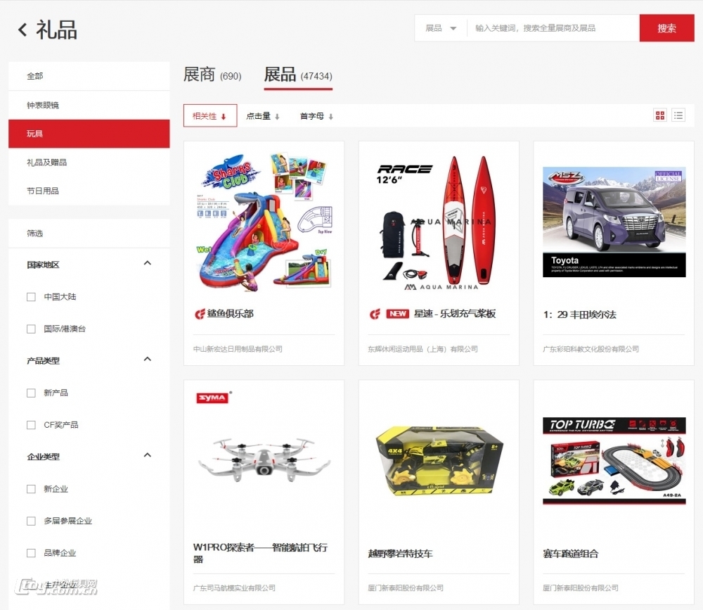 中外玩具網(wǎng)看到,其中玩具展區(qū)位于禮品類目之下,展商690家,已上傳展品47437件。采購商可以與參展商即時溝通和預(yù)約洽談。