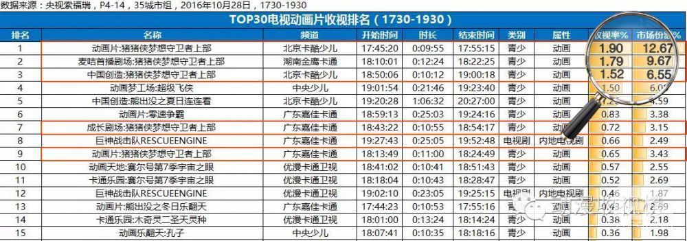在對10月28日至11月6日的動畫收視率統(tǒng)計中,可以看到《豬豬俠之夢想守衛(wèi)者》保持著堅不可摧的頭牌地位,10天的首播周期中,豬豬俠在金鷹、卡酷、嘉佳三大卡通衛(wèi)視的收視率有9次登陸全國收視榜首,讓業(yè)界側(cè)目。