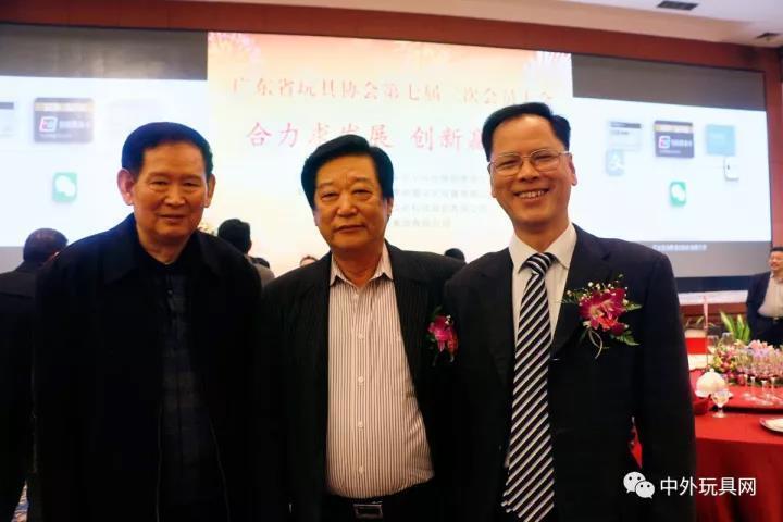 ▲合力求發(fā)展,創(chuàng)新贏未來。2016年廣東省玩具協(xié)會會員大會上,廣東省玩具協(xié)會會長李卓明(右)與澄海玩具協(xié)會會長郭卓才(中)談笑風生并合影